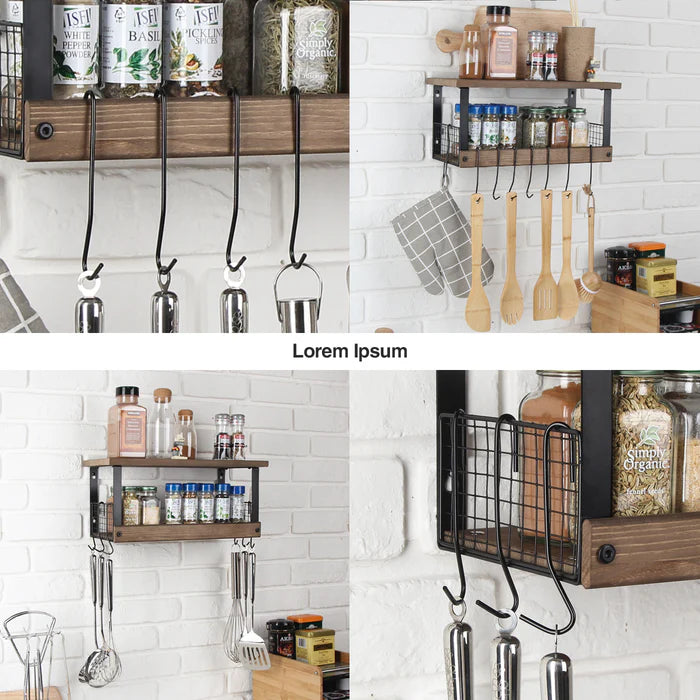 Enhance your kitchen organization with this 2 Tier Rustic Torched Wood Storage Shelf, featuring eight sturdy hooks for versatile hanging options. Crafted from torched wood, it combines durability with a warm, natural aesthetic. The two spacious tiers provide ample room for storing spices, utensils, or decorative items, while the hooks keep mugs, towels, or tools within easy reach. Ideal for maximizing space and adding a touch of rustic charm to your kitchen.