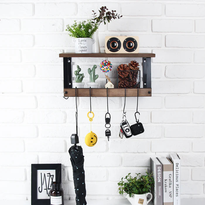 2 Tier Rustic Torched Wood Kitchen Storage Shelf with 8 Hooks