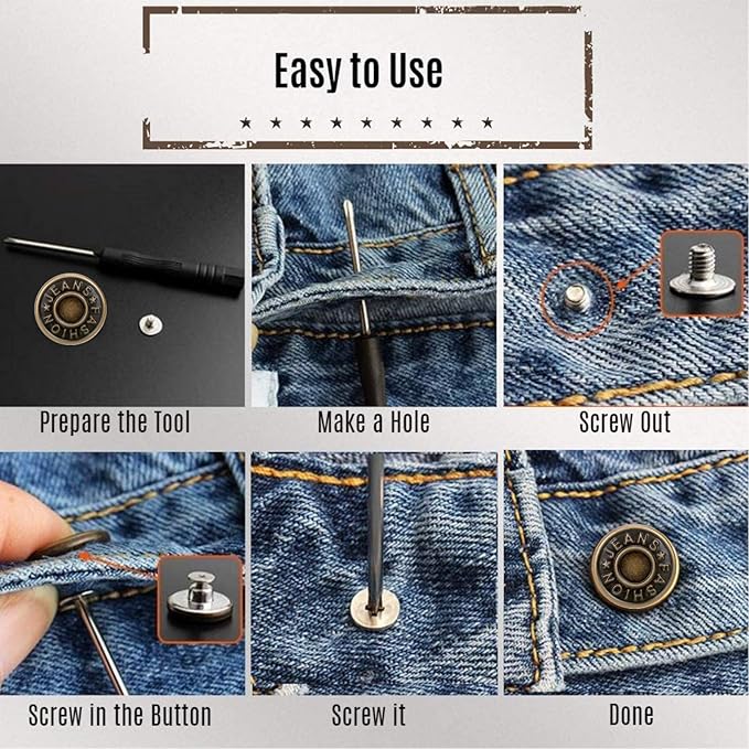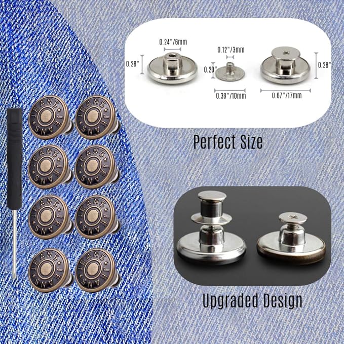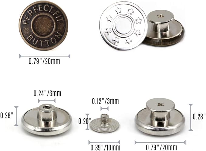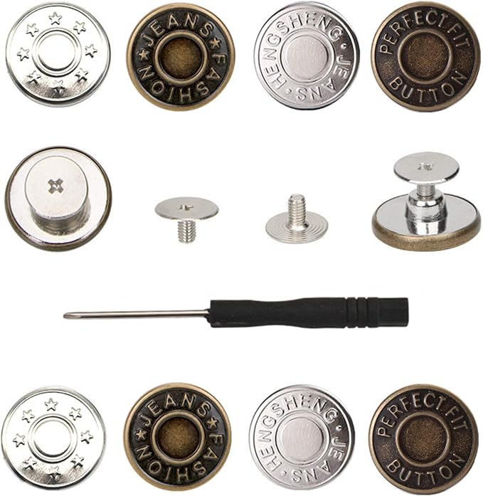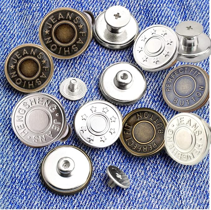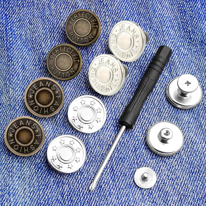 This 30-set Replacement Jean Button Kit offers a convenient, no-sew solution for repairing jeans and other cowboy-style clothing. Each 20mm metal button is removable and designed for easy installation using the included screwdriver, eliminating the need for sewing. Packaged in a durable plastic storage box, this kit is perfect for restoring jackets, pants, and other garments with reliable, long-lasting hardware. Ideal for professionals and DIY enthusiasts seeking efficient and durable button repairs.