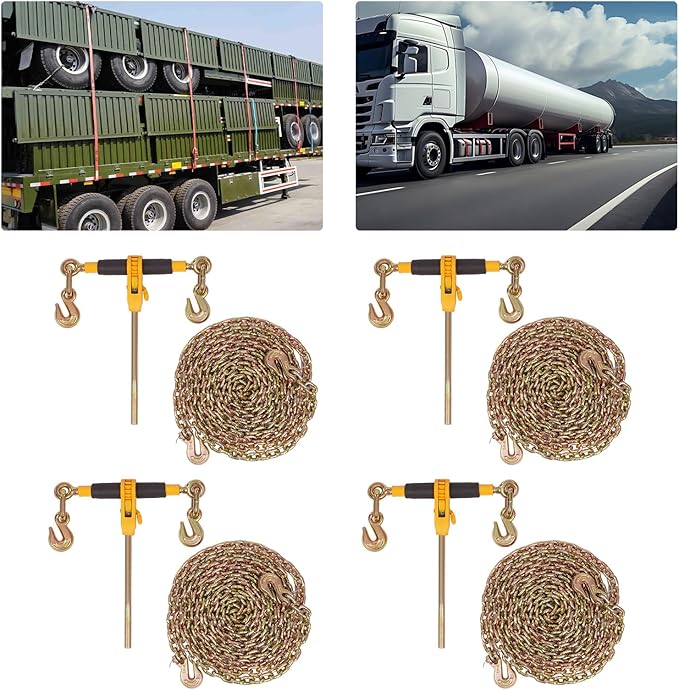 Chain Load Binder, 5/16" -3/8" and 5/16"?o20ft Tie Down Kit w/ 3300LBS Working Load Capacity and Two Grab Hooks, Includes (4) Binders and (4) Chains, Transport Load Package for Hauling