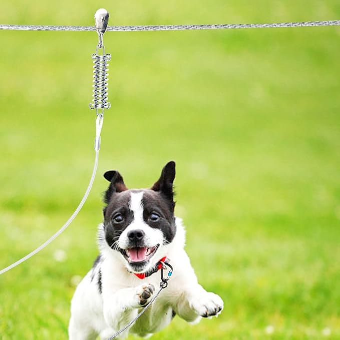 ANTI-SHOCK DOG RUNNER LINE:The shock absorbing spring is located on the tie out cable instead of the long run cable, help your dog reduce the tension more directly to avoid injury, give your pet more freedom and security to run in the yard