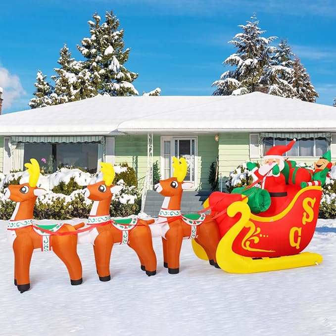 Cute Christmas Decoration - Three deer pulling a sleigh and Santa Claus inflatable with gifts, and built-in bright LED lights, making your inflatable Christmas special and attractive, creating a cozy Christmas spirit for your home.