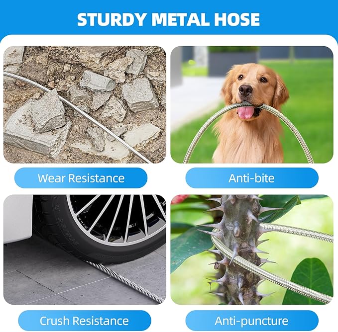 Ultra Durable Garden Hose: Gardening hose is made of high pressure forged 304 stainless steel, its structure is tighter, stronger, durable and less likely to rust, also it can withstand dog's tearing, can be dragged on hard surfaces for a long time, rubbing without breaking, cracking or leaking