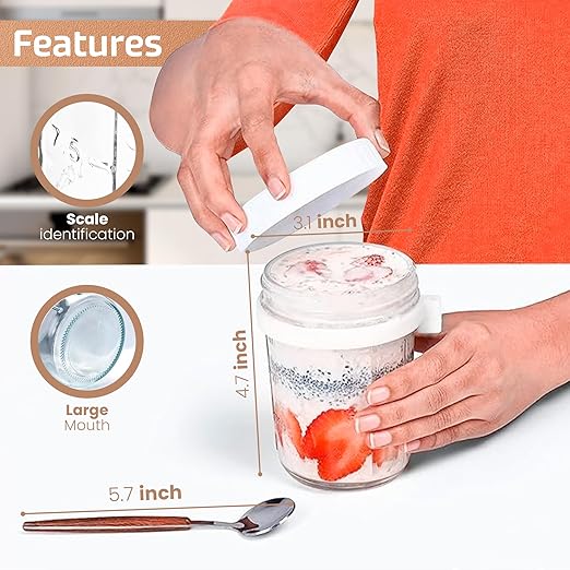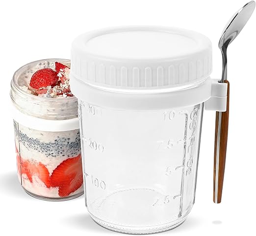 PABLEX - Overnight Oats Cups with Lid - Spoon, 16oz Glass, Reusable Anti Spill, Free Toxic - Overnight Oats Containers with Lids, Oatmeal Containers with Lids, Oats Overnight Container (White)