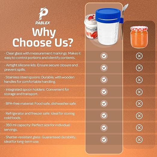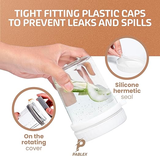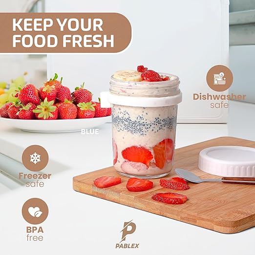 About this item Enjoy your oats onthego with PABLEXs 16oz glass cups Each cup comes with a lid and a spoon making it perfect for busy mornings or quick snacks Perfect if you are looking for oatmeal cups with lids overnight oat containers or overnight oats cup Our PABLEX cups are designed for sustainability Made from highquality glass they are reusable helping you reduce waste and protect the environment Ideal as pudding jars with lids mason jar with spoon oatmeal glass containers with lids or mason jars with spoons PABLEX overnight oats cups are free from harmful toxins You can enjoy your meals with peace of mind knowing they are safe for your health Highly recommended as containers with lids and spoons oat container oats containers with lids overnight oats container or jars for overnight oats The secure lid on our PABLEX cups ensures that your oats stay fresh and contained Perfect for carrying in your bag without worrying about spills Perfect as overnight oats jars with lid chia seed pudding jars overnight oat jars overnight oats glass containers with lids or oatmeal container Ideal for more than just oats Use your PABLEX cups for smoothies salads and other meals The 16oz size offers ample space for a variety of dishes Perfect solution as oatmeal jars chia pudding containers oats container or glass oatmeal containers with lids See more product details