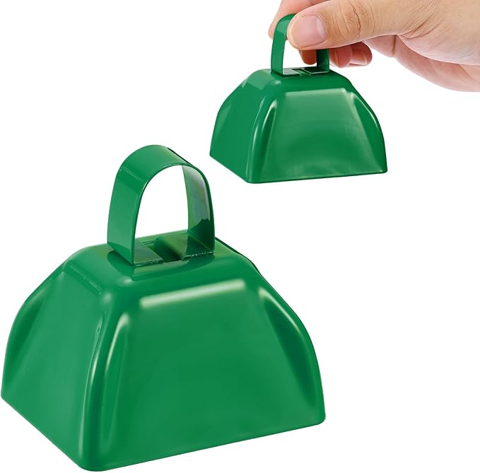 PATIKIL 2pcs Cow Bells for Football Games, 3inch Cowbells for Sporting Events Bulk Loud Noise Makers Metal Cow Bell with Handle for Cheering Competition Marathon Wedding, Green