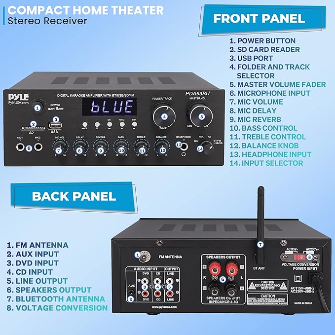 Pyle Stereo Amplifier Audio Receiver with Remote Control - Bluetooth Streaming, MP3/USB/SD/FM Radio, 2.0 Channel HiFi Sound System with RCA/Aux Inputs, Microphone & Headphone Jacks, Adjustable Bass