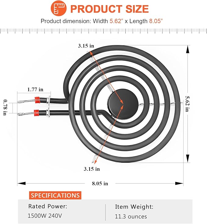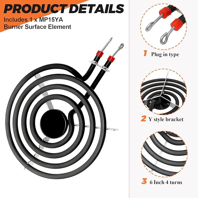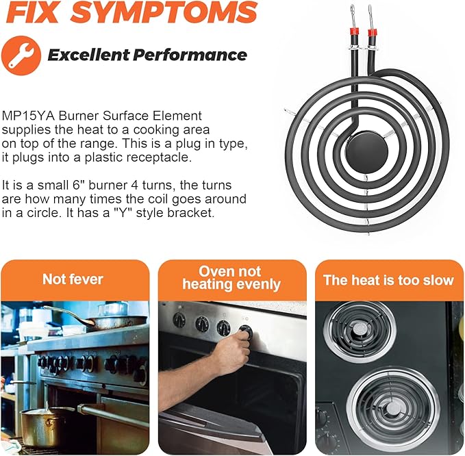 The Upgraded660532 MP15YA Electric Range Burner Element is a 6-inch, 1500W surface element featuring 4 turns for efficient heat distribution. Compatible with Whirlpool and Kenmore ranges, including models wfc310s0ak, rf110axsq3, kf330add1, and ffef3011lwd, this replacement burner ensures reliable performance and consistent cooking results. Its durable design provides long-lasting use, making it an essential component for restoring your range’s heating functionality. Easy to install, it helps maintain optimal stove operation.