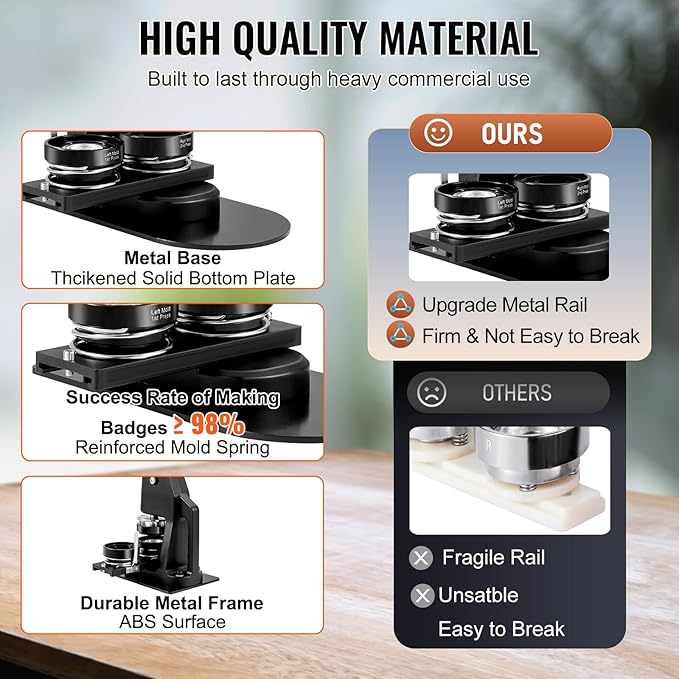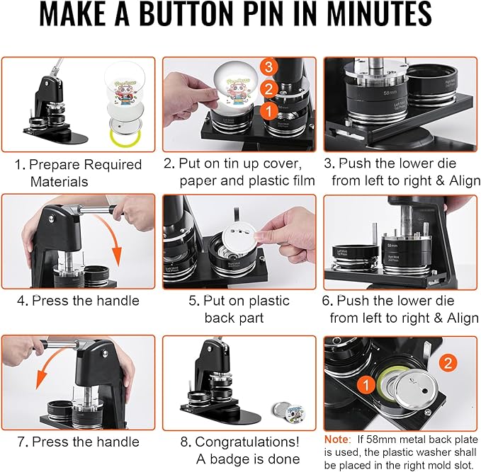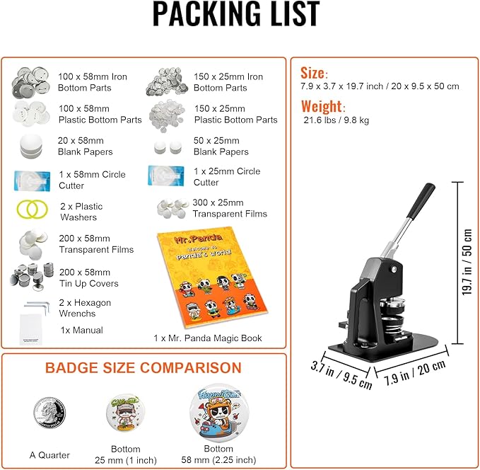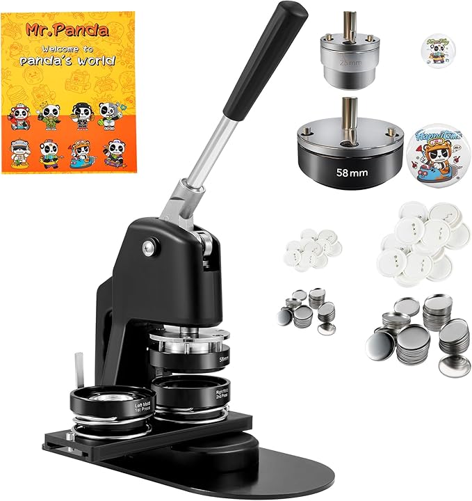 The Vevor 3-in-1 Button Maker Machine is a versatile pin press kit designed to create buttons in three sizes: 1 inch, 1.25 inches, and 2.28 inches (25mm, 32mm, and 58mm). Engineered for precision and ease of use, this machine allows for efficient production of custom buttons, badges, and pins. Its durable construction ensures consistent results, making it ideal for hobbyists, small businesses, and promotional projects. The compact design supports quick setup and operation, streamlining your button-making process with professional-quality output.