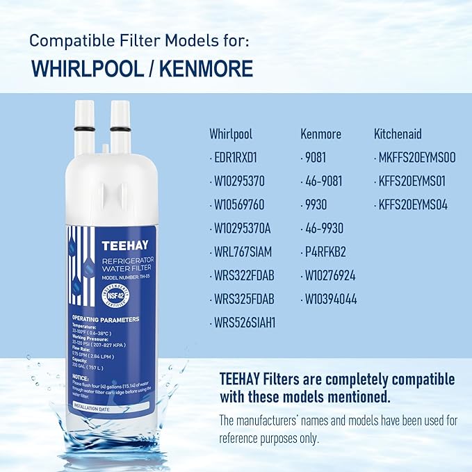 This 3-pack water filter replacement is compatible with models P8RFWB2L, P4RFKB2, P8WB2L, WHR1RXD1, W10394044, and WRS588FIHZ. Designed for expert-level filtration, these filters effectively reduce contaminants to provide clean, fresh-tasting water and ice. Easy to install and maintain, they help preserve your refrigerator’s performance and support your household’s health by ensuring high-quality water filtration. Ideal for users seeking reliable and certified replacement filters.