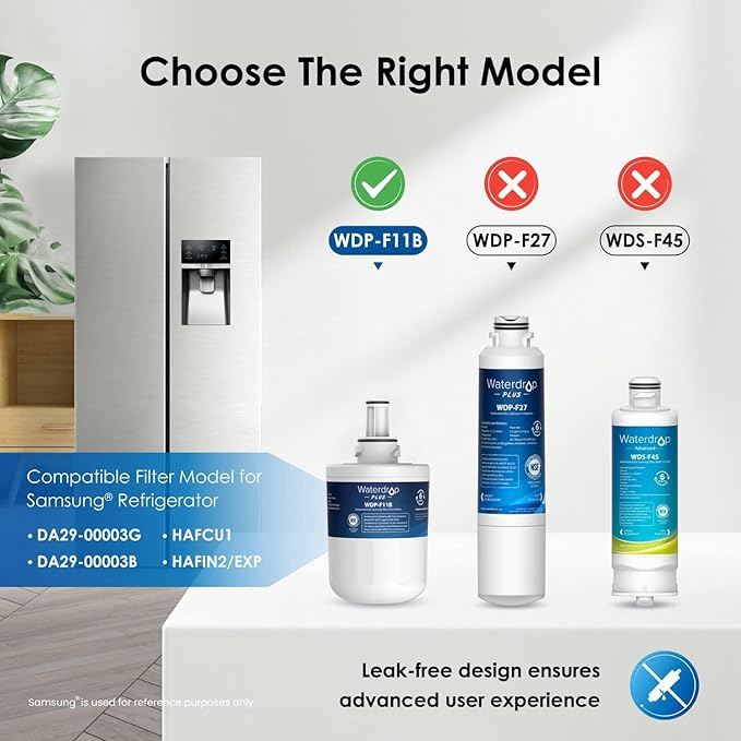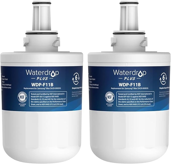 The Waterdrop Plus DA29-00003G Refrigerator Water Filter pack includes two filters certified by NSF 401 and 5342, ensuring advanced reduction of contaminants for cleaner, safer water. Designed as replacements for Samsung models DA29-00003G, DA29-00003B, DA29-00003A, Aqua-Pure Plus, and HAFCU1, these filters deliver reliable performance and easy installation. Ideal for maintaining optimal water quality and protecting your household’s health with expert-grade filtration technology.