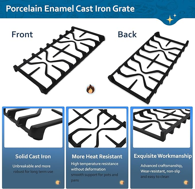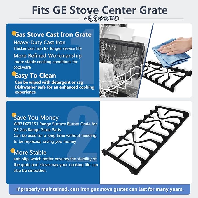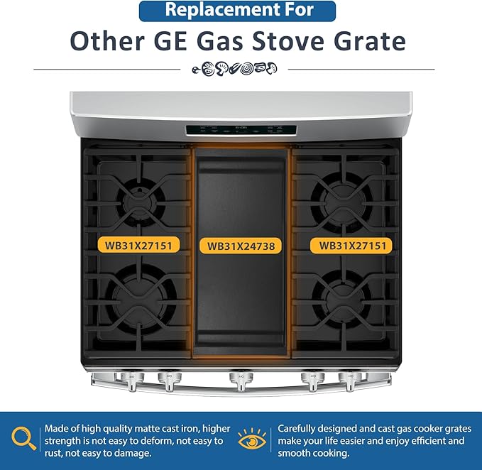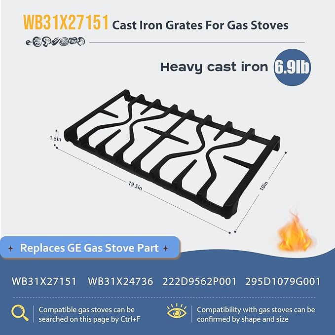 This stove grate replacement, compatible with GE part numbers WB31X27151 and WB31X24736, is designed for GE gas cooktops and side surface ovens. Made from durable cast iron, it provides a sturdy and stable cooking surface that withstands high temperatures. This single-piece grate ensures a precise fit, restoring your cooktop’s functionality and enhancing safety during cooking. Ideal for replacing worn or damaged grates to maintain optimal performance and longevity of your appliance.